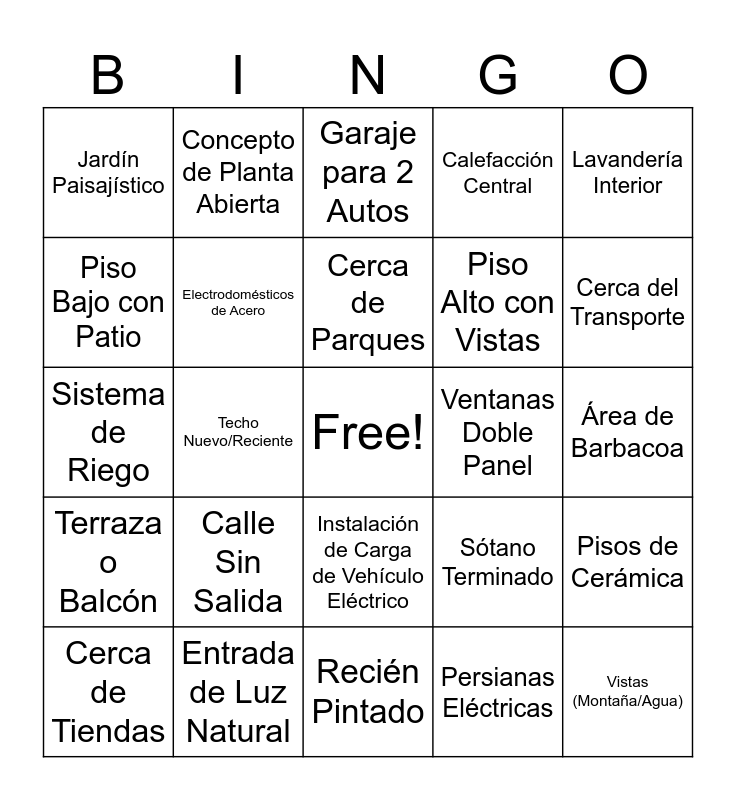 This bingo card has a free space and 36 words: Vestidor en Habitación Principal, Chimenea en Sala de Estar, Suelos de Madera, Electrodomésticos de Acero, Sótano Terminado, Terraza o Balcón, Cerca de Parques, Oficina en Casa, Lavandería Interior, Paneles Solares, Techo Nuevo/Reciente, Calefacción Central, Sistema de Seguridad, Ventanas Doble Panel, Cerca del Transporte, Jardín Paisajístico, Entrada Pavimentada, Calle Sin Salida, Vistas (Montaña/Agua), Garaje para 2 Autos, Área de Barbacoa, Pisos de Cerámica, Entrada de Luz Natural, Cerca de Tiendas, Recién Pintado, Concepto de Planta Abierta, Sistema de Riego, Jacuzzi o Bañera, Piso Alto con Vistas, Piso Bajo con Patio, Recién Remodelado, Bodega/Almacenamiento, Persianas Eléctricas, Instalación de Carga de Vehículo Eléctrico, Smart Home Ready and Ascensor en el Edificio.