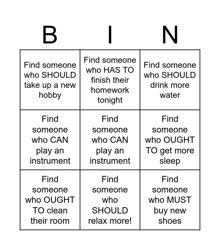 This bingo card has a free space and 11 words: Find someone who HAS TO speak more than one language in their daily life, Find someone who SHOULD relax more!, Find someone who MUST buy new shoes, Find someone who OUGHT TO clean their room, Find someone who HAS TO finish their homework tonight, Find someone who SHOULD drink more water, Find someone who OUGHT TO get more sleep, Find someone who MUST call their mom, Find someone who CAN play an instrument, Find someone who SHOULD take up a new hobby and Find someone who CAN drive a car.