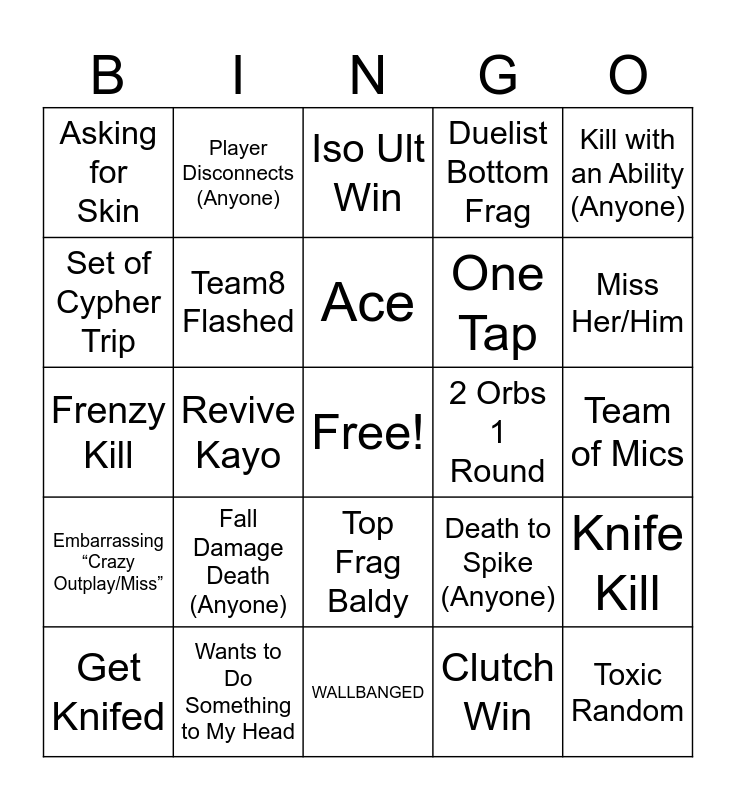 This bingo card has a free space and 24 words: Fall Damage Death (Anyone), Wants to Do Something to My Head, Ace, Get Knifed, Kill with an Ability (Anyone), Asking for Skin, Set of Cypher Trip, Player Disconnects (Anyone), 2 Orbs 1 Round, Top Frag Baldy, One Tap, Frenzy Kill, Death to Spike (Anyone), Knife Kill, Team8 Flashed, Clutch Win, Team of Mics, Iso Ult Win, Miss Her/Him, Revive Kayo, Toxic Random, Embarrassing “Crazy Outplay/Miss”, Duelist Bottom Frag and WALLBANGED.