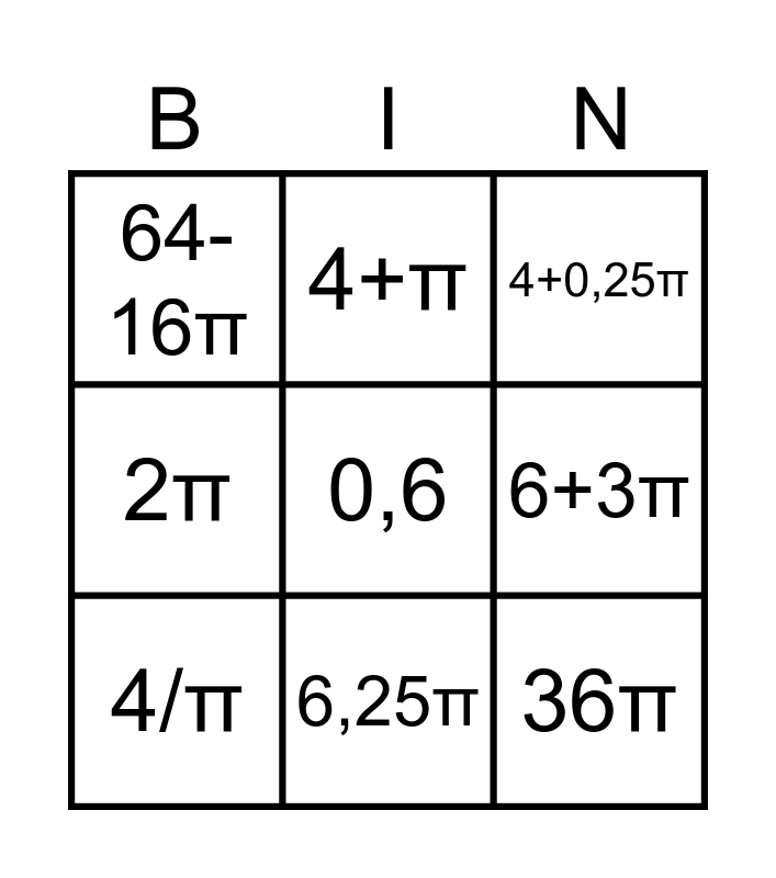 This bingo card has a free space and 11 words: 6,34π, 6,25π, 36π, 4/π, 4+π, 4+0,25π, 6+3π, 6,7, 2π, 64-16π and 49-4π.