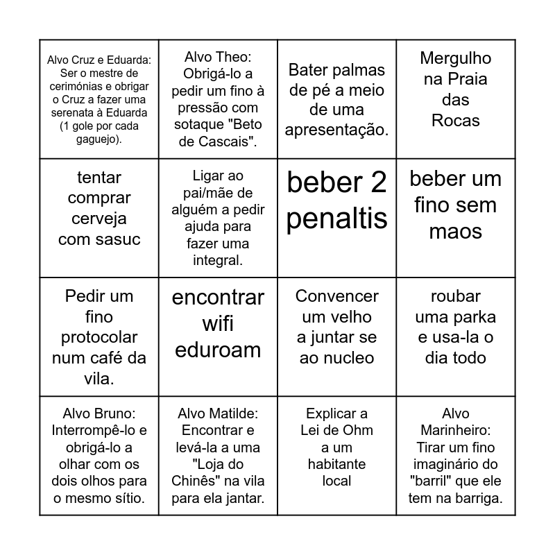 This bingo card has 16 words: Alvo Matilde: Encontrar e levá-la a uma "Loja do Chinês" na vila para ela jantar., roubar uma parka e usa-la o dia todo, Bater palmas de pé a meio de uma apresentação., Alvo Cruz e Eduarda: Ser o mestre de cerimónias e obrigar o Cruz a fazer uma serenata à Eduarda (1 gole por cada gaguejo)., Pedir um fino protocolar num café da vila., Alvo Theo: Obrigá-lo a pedir um fino à pressão com sotaque "Beto de Cascais"., Convencer um velho a juntar se ao nucleo, Explicar a Lei de Ohm a um habitante local, tentar comprar cerveja com sasuc, Ligar ao pai/mãe de alguém a pedir ajuda para fazer uma integral., Alvo Bruno: Interrompê-lo e obrigá-lo a olhar com os dois olhos para o mesmo sítio., Mergulho na Praia das Rocas, encontrar wifi eduroam, beber um fino sem maos, beber 2 penaltis and Alvo Marinheiro: Tirar um fino imaginário do "barril" que ele tem na barriga..