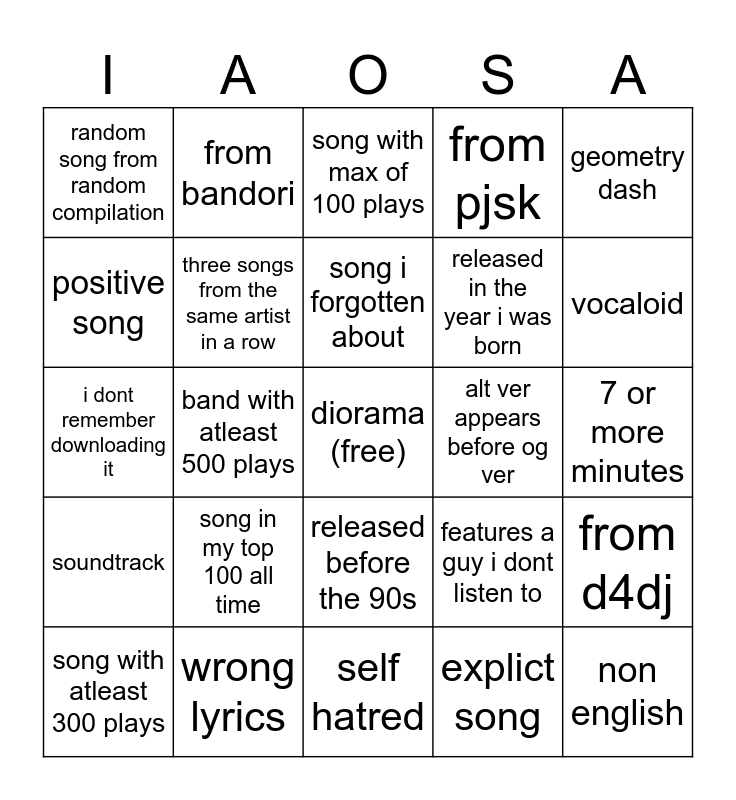 This bingo card has a free space and 29 words: song with atleast 300 plays, ballad/slow, band with atleast 500 plays, cover, random song from random compilation, song with max of 100 plays, three songs from the same artist in a row, song in my top 100 all time, alt ver appears before og ver, wrong lyrics, 7 or more minutes, non english, self hatred, explict song, vocaloid, instrumental, released before the 90s, soundtrack, geometry dash, i dont remember downloading it, features a guy i dont listen to, released in this or last year, released in the year i was born, positive song, from pjsk, from bandori, from d4dj, song i forgotten about and from top 8 on lastfm (no diorama).
