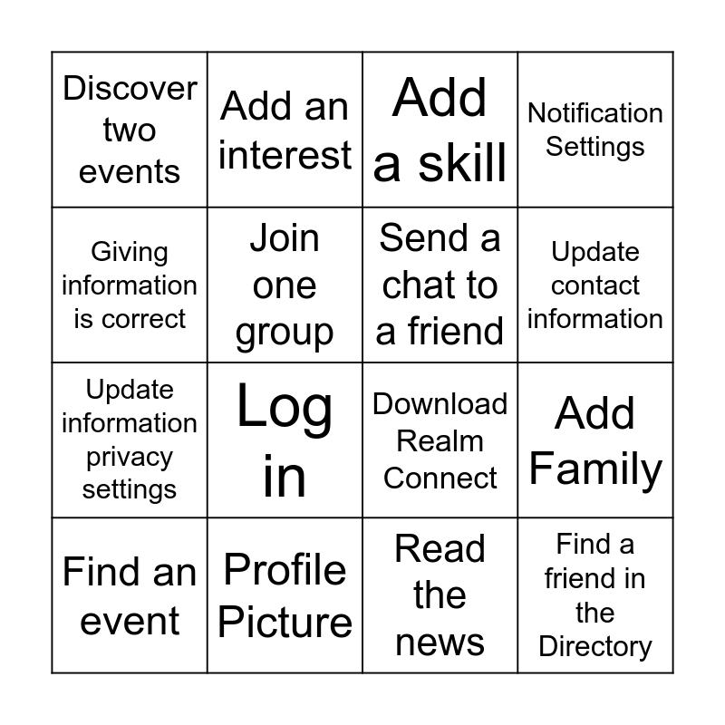 This bingo card has 16 words: Profile Picture, Add Family, Add a skill, Discover two events, Update information privacy settings, Add an interest, Download Realm Connect, Read the news, Giving information is correct, Join one group, Find an event, Notification Settings, Log in, Update contact information, Send a chat to a friend and Find a friend in the Directory.