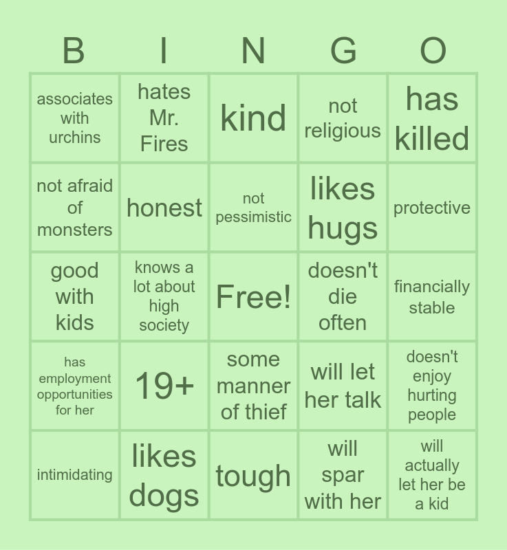 This bingo card has a free space and 24 words: 19+, likes dogs, not pessimistic, intimidating, has killed, associates with urchins, not afraid of monsters, hates Mr. Fires, doesn't die often, some manner of thief, likes hugs, good with kids, will let her talk, doesn't enjoy hurting people, honest, will spar with her, financially stable, kind, protective, knows a lot about high society, will actually let her be a kid, has employment opportunities for her, not religious and tough.