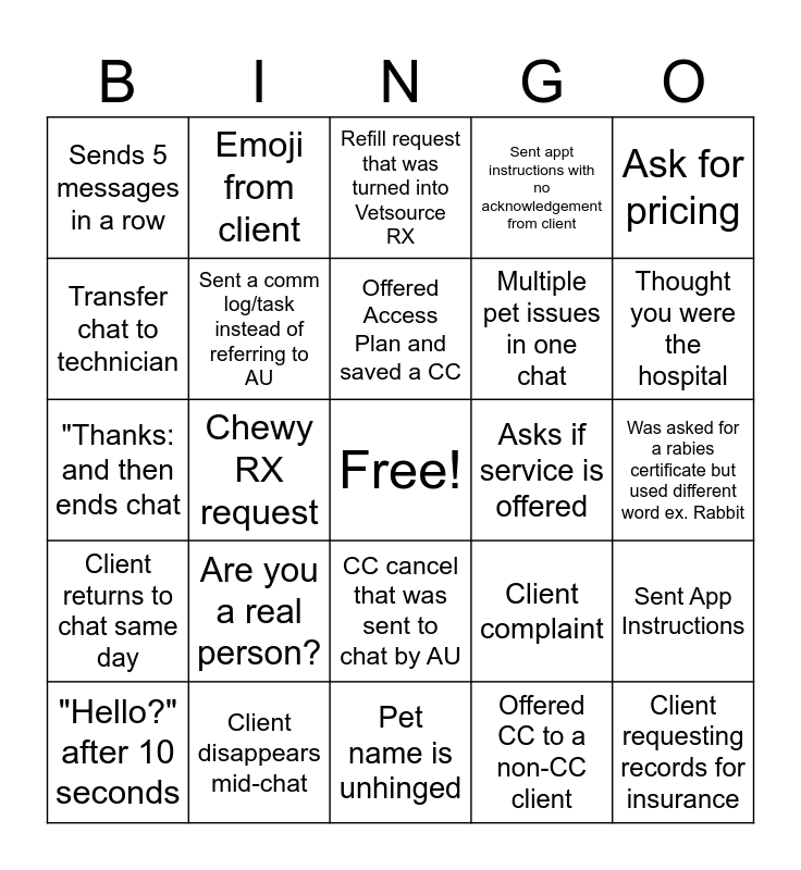 This bingo card has a free space and 24 words: Are you a real person?, Client disappears mid-chat, Offered Access Plan and saved a CC, "Hello?" after 10 seconds, Ask for pricing, Sends 5 messages in a row, Transfer chat to technician, Emoji from client, Asks if service is offered, CC cancel that was sent to chat by AU, Multiple pet issues in one chat, "Thanks: and then ends chat, Client complaint, Sent App Instructions, Sent a comm log/task instead of referring to AU, Offered CC to a non-CC client, Was asked for a rabies certificate but used different word ex. Rabbit, Refill request that was turned into Vetsource RX, Thought you were the hospital, Chewy RX request, Client requesting records for insurance, Client returns to chat same day, Sent appt instructions with no acknowledgement from client and Pet name is unhinged.