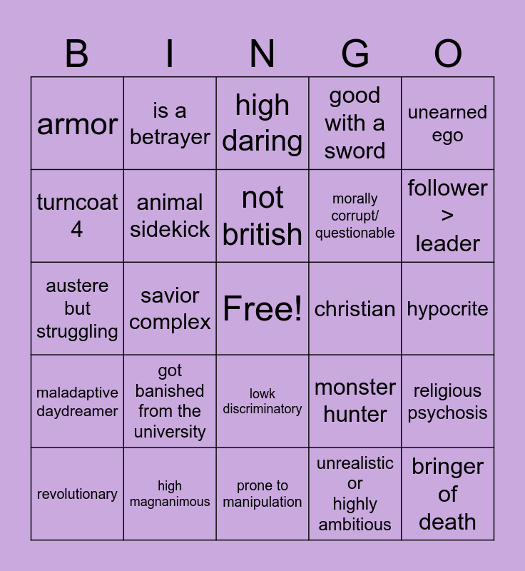 This bingo card has a free space and 24 words: got banished from the university, high magnanimous, not british, revolutionary, unearned ego, armor, turncoat 4, is a betrayer, christian, lowk discriminatory, morally corrupt/ questionable, austere but struggling, monster hunter, religious psychosis, animal sidekick, unrealistic or highly ambitious, hypocrite, high daring, follower > leader, savior complex, bringer of death, maladaptive daydreamer, good with a sword and prone to manipulation.