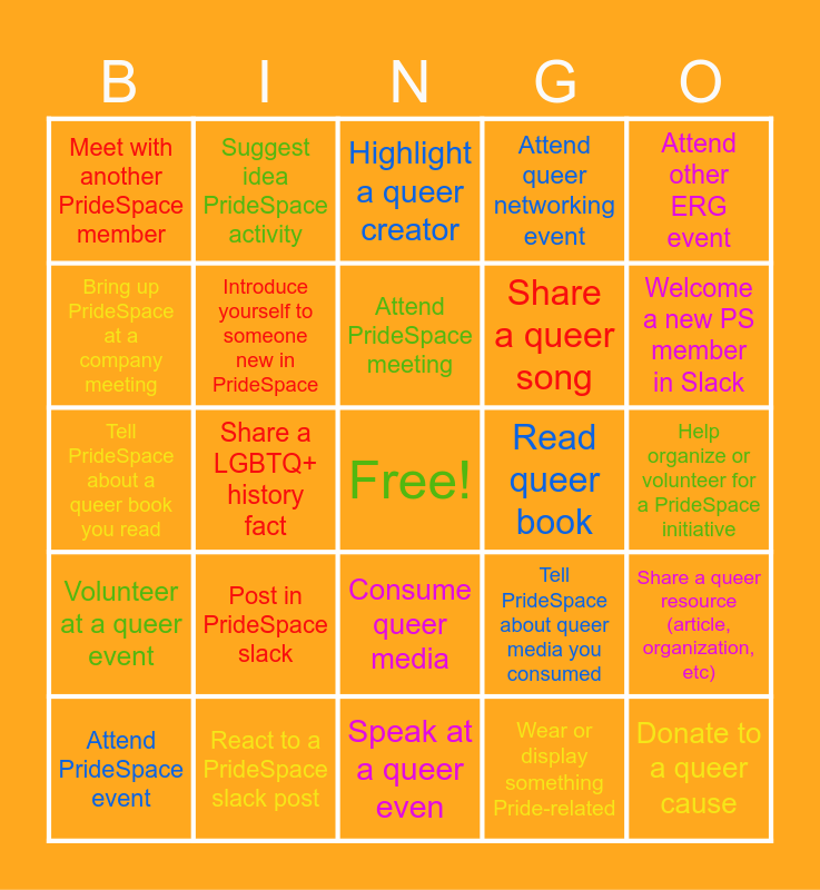 This bingo card has a free space and 24 words: Post in PrideSpace slack, React to a PrideSpace slack post, Attend PrideSpace meeting, Attend PrideSpace event, Attend other ERG event, Meet with another PrideSpace member, Bring up PrideSpace at a company meeting, Suggest idea PrideSpace activity, Read queer book, Consume queer media, Share a queer song, Tell PrideSpace about a queer book you read, Tell PrideSpace about queer media you consumed, Share a queer resource (article, organization, etc), Introduce yourself to someone new in PrideSpace, Wear or display something Pride-related, Help organize or volunteer for a PrideSpace initiative, Highlight a queer creator, Welcome a new PS member in Slack, Share a LGBTQ+ history fact, Donate to a queer cause, Volunteer at a queer event, Attend queer networking event and Speak at a queer even.