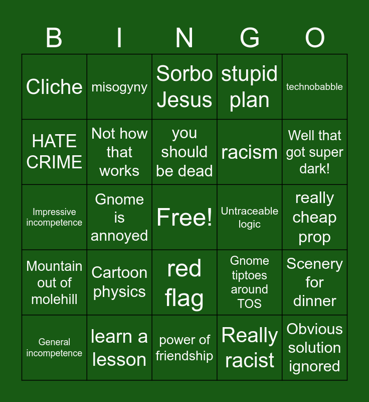 This bingo card has a free space and 28 words: Scenery for dinner, Red herring, racism, Really racist, HATE CRIME, Sorbo Jesus, misogyny, Mountain out of molehill, Untraceable logic, General incompetence, Impressive incompetence, stupid plan, learn a lesson, power of friendship, Well that got super dark!, groan inducing line, Cartoon physics, Not how that works, you should be dead, red flag, Cliche, made it worse, Obvious solution ignored, Gnome is annoyed, really cheap prop, Gnome tiptoes around TOS, technobabble and "hero" speech.