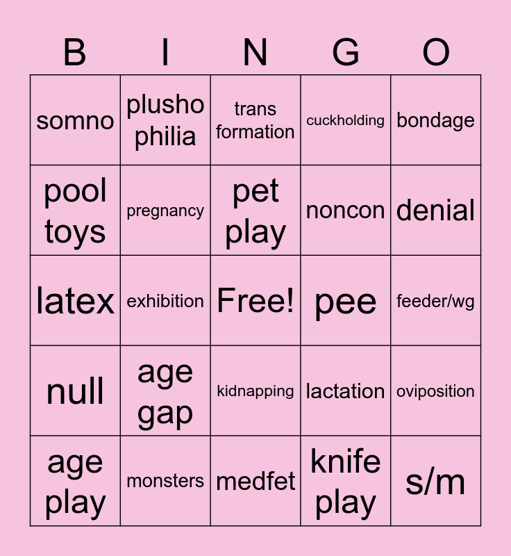 This bingo card has a free space and 24 words: age play, age gap, pet play, knife play, bondage, somno, plusho philia, trans formation, pee, feeder/wg, latex, pregnancy, lactation, oviposition, pool toys, monsters, medfet, cuckholding, denial, null, exhibition, kidnapping, noncon and s/m.