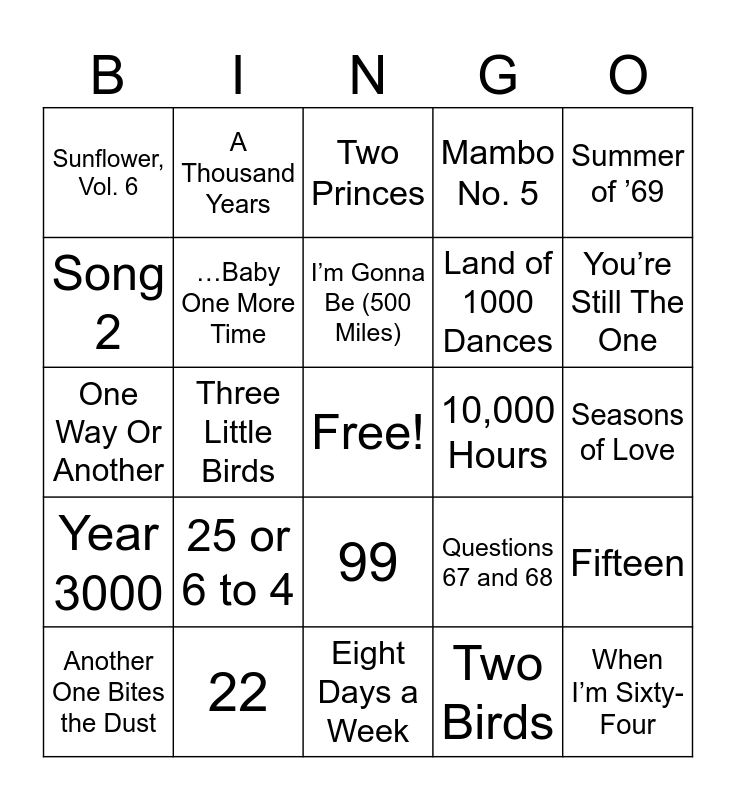 This bingo card has a free space and 33 words: Take Five, Just The Two Of Us, Three Little Birds, 9 to 5, Year 3000, …Baby One More Time, Summer of ’69, Another One Bites the Dust, A Thousand Years, A Thousand Miles, I’m Gonna Be (500 Miles), Two Princes, Seven Nation Army, Sk8er Boi, 10,000 Hours, You’re Still The One, 22, One Way Or Another, 25 or 6 to 4, Questions 67 and 68, 99, One, Sunflower, Vol. 6, Seasons of Love, Eight Days a Week, When I’m Sixty-Four, Mambo No. 5, Land of 1000 Dances, Song 2, Fifteen, 1979, Two Birds and seven.