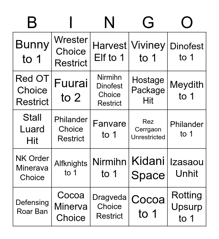 This bingo card has 25 words: Alfknights to 1, Dragveda Choice Restrict, Nirmihn Dinofest Choice Restrict, Defensing Roar Ban, Dinofest to 1, Bunny to 1, Red OT Choice Restrict, Wrester Choice Restrict, Rez Cerrgaon Unrestricted, Nirmihn to 1, Hostage Package Hit, Stall Luard Hit, Kidani Space, Izasaou Unhit, Fuurai to 2, Rotting Upsurp to 1, Philander to 1, Harvest Elf to 1, Meydith to 1, Philander Choice Restrict, Fanvare to 1, Cocoa Minerva Choice, NK Order Minerava Choice, Viviney to 1 and Cocoa to 1.