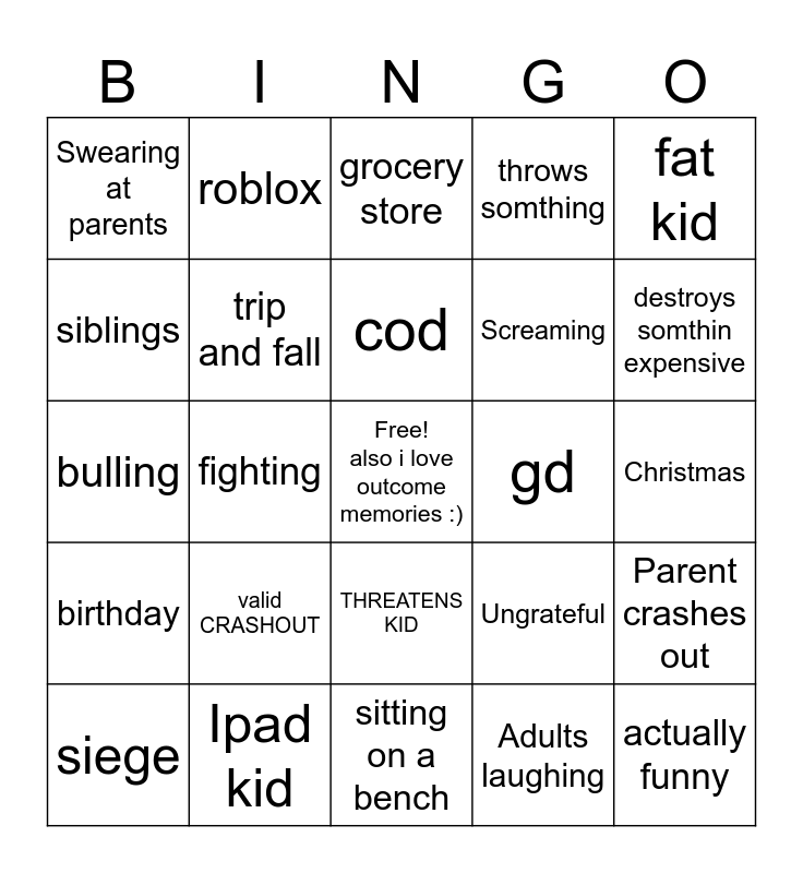This bingo card has a free space and 24 words: valid CRASHOUT, Ipad kid, cod, siege, fat kid, Swearing at parents, siblings, roblox, gd, THREATENS KID, Screaming, bulling, Ungrateful, Parent crashes out, trip and fall, Adults laughing, Christmas, grocery store, destroys somthin expensive, fighting, actually funny, birthday, throws somthing and sitting on a bench.