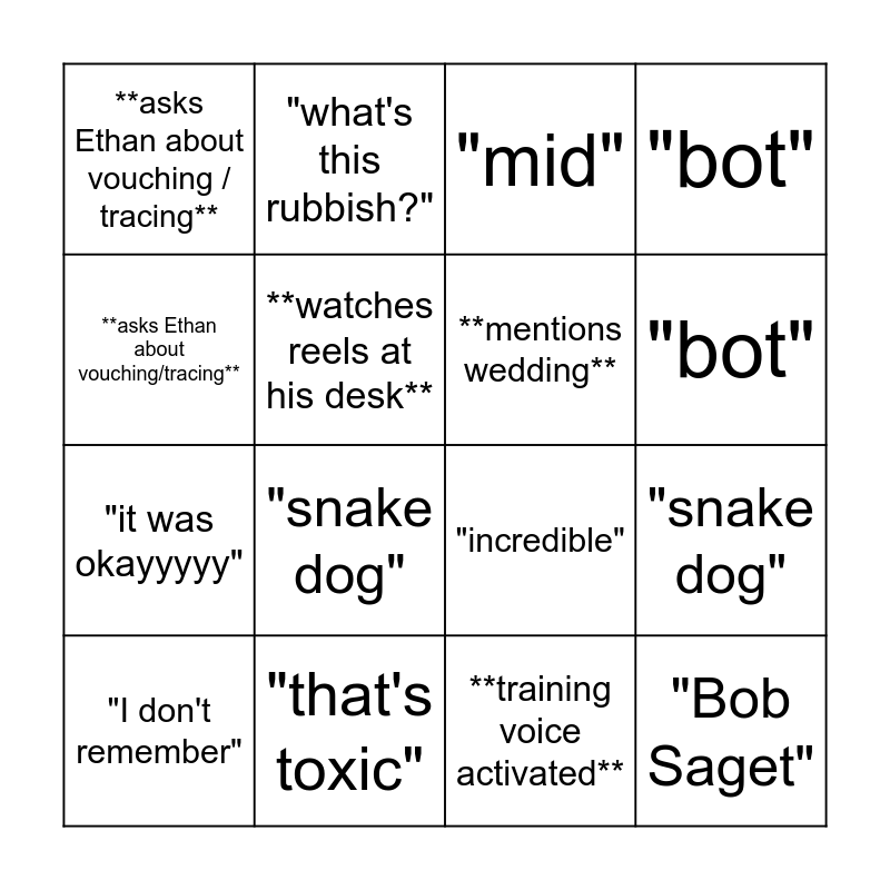 This bingo card has 1 images and 33 words: Free!, "wot the helli", "what the fruit", "Bob Saget", **mentions wedding**, **asks Ethan about vouching/tracing**, **training voice activated**, "what's this rubbish?", "I don't remember", "bot", "mid", "it was okayyyyy", **watches reels at his desk**, "that's toxic", "snake dog", "you're a dog", "incredible", "wot the helli", "what the fruit", "Bob Saget", **mentions wedding**, **asks Ethan about vouching / tracing**, **training voice activated**, "what's this rubbish?", "I don't remember", "bot", "mid", "it was okayyyyy", **watches reels at his desk**, "that's toxic", "snake dog", "you're a dog" and "incredible".
