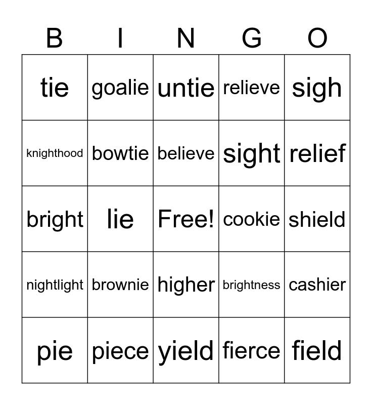 This bingo card has a free space and 29 words: pie, pies, lie, die, tie, untie, bowtie, brownie, cookie, piece, shield, field, yield, fierce, relief, high, higher, nightlight, sigh, bright, brightness, sighted, sight, knighthood, relieve, goalie, cashier, believe and grief.
