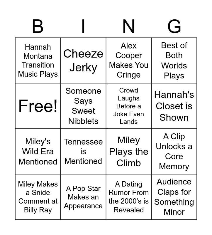 This bingo card has 16 words: A Pop Star Makes an Appearance, A Clip Unlocks a Core Memory, Alex Cooper Makes You Cringe, Hannah Montana Transition Music Plays, Miley's Wild Era Mentioned, Cheeze Jerky, Miley Plays the Climb, A Dating Rumor From the 2000's is Revealed, Free!, Someone Says Sweet Nibblets, Miley Makes a Snide Comment at Billy Ray, Best of Both Worlds Plays, Tennessee is Mentioned, Hannah's Closet is Shown, Crowd Laughs Before a Joke Even Lands and Audience Claps for Something Minor.