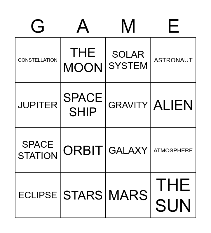 This bingo card has 28 words: COMET, TELESCOPE, SPACE STATION, SATELLITE, SPACE SHIP, SOLAR SYSTEM, THE MOON, THE SUN, STARS, PLANETS, GALAXY, ASTRONAUT, THE EARTH, METEORITE, ORBIT, NEBULA, BLACK HOLE, GRAVITY, ALIEN, UFO, CONSTELLATION, ASTRONOMER, ECLIPSE, ATMOSPHERE, MARS, MERCURY, JUPITER and SATURN.
