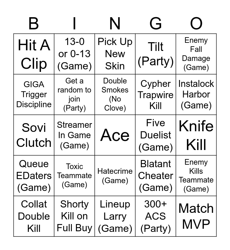 This bingo card has a free space and 24 words: Toxic Teammate (Game), Shorty Kill on Full Buy, Double Smokes (No Clove), Collat Double Kill, Enemy Fall Damage (Game), Hit A Clip, GIGA Trigger Discipline, 13-0 or 0-13 (Game), Five Duelist (Game), Hatecrime (Game), Cypher Trapwire Kill, Sovi Clutch, Blatant Cheater (Game), Enemy Kills Teammate (Game), Get a random to join (Party), 300+ ACS (Party), Knife Kill, Pick Up New Skin, Instalock Harbor (Game), Streamer In Game (Game), Match MVP, Queue EDaters (Game), Tilt (Party) and Lineup Larry (Game).