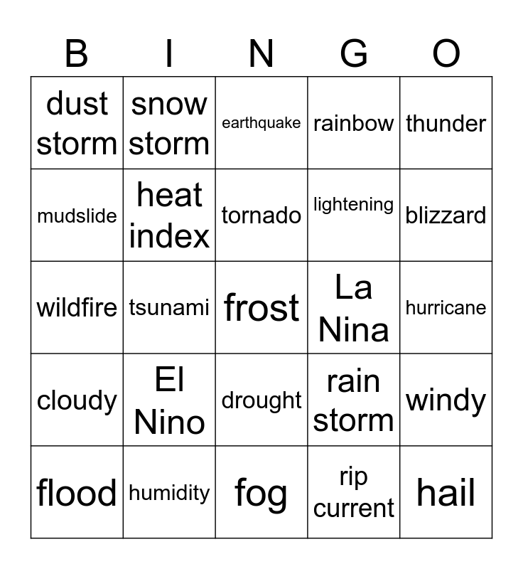 This bingo card has 25 words: El Nino, fog, tornado, flood, thunder, dust storm, mudslide, snow storm, La Nina, drought, lightening, wildfire, rain storm, windy, heat index, hail, hurricane, earthquake, blizzard, tsunami, frost, humidity, cloudy, rainbow and rip current.