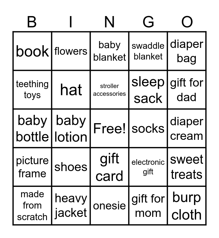 This bingo card has a free space and 29 words: made from scratch, wipes, baby lotion, diapers, book, baby blanket, hat, shoes, socks, heavy jacket, diaper cream, burp cloth, onesie, gift for mom, gift for dad, t-shirt and shorts set, gift card, picture frame, diaper bag, baby bottle, electronic gift, wash cloth, sleep sack, teething toys, swaddle blanket, flowers, sweet treats, stroller accessories and activity mat.