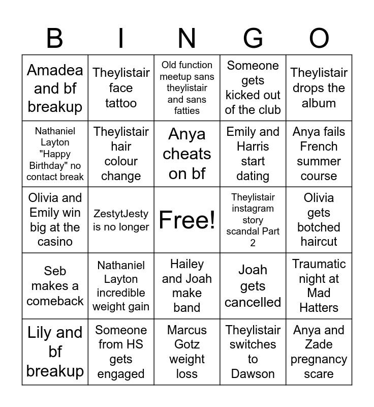 This bingo card has a free space and 49 words: Melissa P and her Bf breakup, Anya and Zade pregnancy scare, Nathaniel Layton haircut, Marcus Gotz weight loss, Nathaniel Layton incredible weight gain, Amadea bad new tattoo, Theylistair face tattoo, Queen of Israel becomes super jew, Nathaniel Layton "Happy Birthday" no contact break, Cafe Campus fire, Theylistair hair colour change, Someone gets kicked out of the club, Traumatic night at Mad Hatters, Joah gets cancelled, Queen Israel hard launches TWO boyfriends, Marcus Gotz get non-binary significant other, Anya cheats on bf, Theylistair instagram story scandal Part 2, Theylistair and Queen of Israel new band WITHOUT Marcus, Theylistair drops the album, ZestytJesty is no longer, Theylistair switches to Dawson, Amadea and bf breakup, Emily and Harris start dating, Olivia gets accepted to McGill, Anya fails French summer course, Lily and bf breakup, Lily and Joah reunion, Hailey and Joah make band, Seb makes a comeback, Noah and Kaiden messy breakup, Emily pregnancy scare, Olivia pregnancy scare, Someone from HS announces pregnancy, Someone from HS gets engaged, Amber Bilo and Bf breakup, Val hard launches bf, Emily goes back to micro bangs, Olivia gets botched haircut, Olivia Borkity and Anya public feud, Sam and Olivia Borkity no more, Nathaniel Layton spotting at Dawson, Selina and Tyler breakup, Jack Griffin gets gf, Olivia and Emily win big at the casino, Old function meetup sans theylistair and sans fatties, Amadea and Anya beef, Nathaniel Layton new tattoo and Theylistair failed situatiionship.