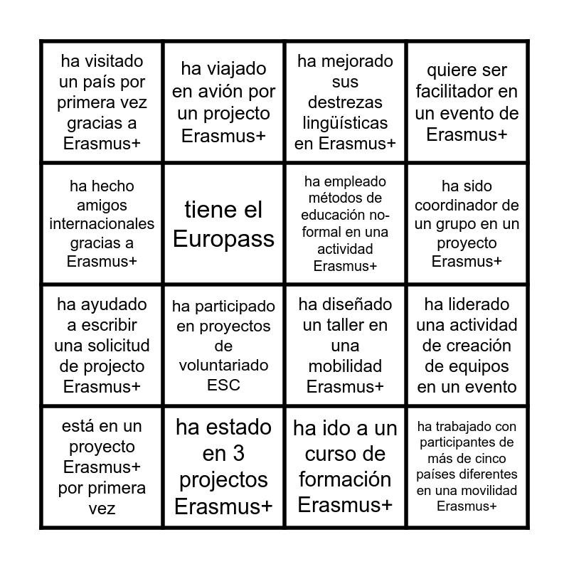 This bingo card has 16 words: ha estado en 3 projectos Erasmus+, ha liderado una actividad de creación de equipos en un evento, ha mejorado sus destrezas lingüísticas en Erasmus+, ha visitado un país por primera vez gracias a Erasmus+, ha ayudado a escribir una solicitud de projecto Erasmus+, ha viajado en avión por un projecto Erasmus+, ha diseñado un taller en una mobilidad Erasmus+, ha ido a un curso de formación Erasmus+, ha hecho amigos internacionales gracias a Erasmus+, tiene el Europass, está en un proyecto Erasmus+ por primera vez, quiere ser facilitador en un evento de Erasmus+, ha participado en proyectos de voluntariado ESC, ha sido coordinador de un grupo en un proyecto Erasmus+, ha empleado métodos de educación no-formal en una actividad Erasmus+ and ha trabajado con participantes de más de cinco países diferentes en una movilidad Erasmus+.