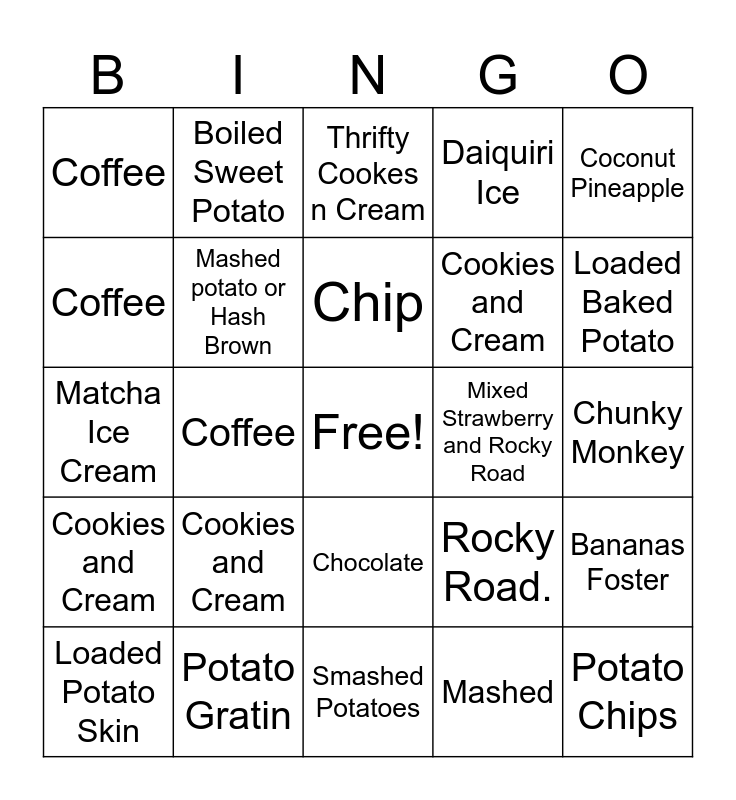 This bingo card has a free space and 63 words: Chocolate, Bacon & Yogurt, Banana Split, Bananas Foster, Ben & Jerry's Cherry Garcia, Boiled Power Potato, Boiled Sweet Potato, Cherry, Chip, Chocolate, Chocolate, Chocolate Chip Cookies, Chunky Monkey, Coconut Pineapple, Coffee, Coffee, Coffee, Coffee, Coffee Ice Cream, Cookies and Cream, Cookies and Cream, Cookies and Cream, Daiquiri Ice, Dirty Loaded Tots, Fingerling, Fondant Potatoes, French Fries, Garlic and feta mashed potatoes, Gnocchi Speziato, Green Cardamom and Rose Infused slow churned vanilla ice cream with baklava crumbles and dark chocolate ganache drizzle, Half Pistachio and Half Black Sesame Gelato, Home Fries, In n Out Animal Style, Japanese Sweet Potato, Loaded Baked Potato, Loaded Potato Skin, Mashed, Mashed, Mashed, Mashed potato or Hash Brown, Matcha Ice Cream, Mixed Strawberry and Rocky Road, Papa Rellena, Patatas Bravas, Potato Chips, Potato Gratin, Roasted Yukon Gold potatoes drizzled in olive oil with Rosemary and salt & pepper, Rocky Road., Rum Raisin Ice Cream, Sea Salt and Vinegar Potato Chips, Sea Salt and Vinegar Potato Chips, Smashed Potatoes, Spudbros Jacket Potato, Strawberry Cheesecake, Sweet Potato Fry, Thrifty Cookes n Cream, Ube, Vanilla + Coffee + Mango with Chocolate Topping, Vanilla or Coffee, Waffle Fries, Waffle Fry, Waffle Fry and Wanderlust's Japanese Neapolitan.