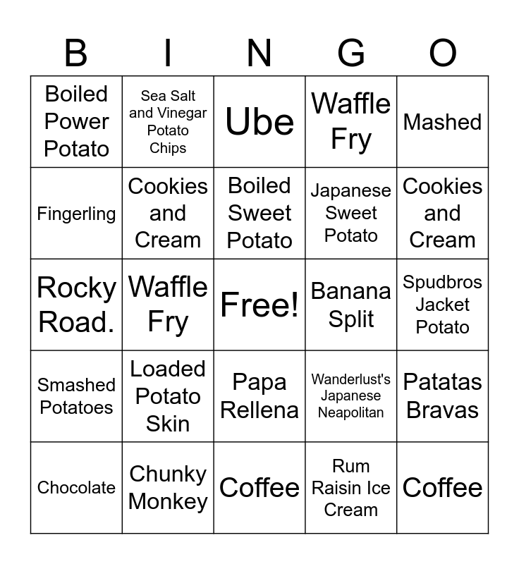 This bingo card has a free space and 63 words: Roasted Yukon Gold potatoes drizzled in olive oil with Rosemary and salt & pepper, French Fries, Fondant Potatoes, Patatas Bravas, Sea Salt and Vinegar Potato Chips, Potato Chips, Sea Salt and Vinegar Potato Chips, Sweet Potato Fry, Boiled Sweet Potato, Chip, Papa Rellena, Mashed, Spudbros Jacket Potato, Mashed, Home Fries, Fingerling, Waffle Fry, Boiled Power Potato, Gnocchi Speziato, Japanese Sweet Potato, Loaded Potato Skin, Smashed Potatoes, Waffle Fry, Waffle Fries, Mashed, Loaded Baked Potato, Mashed potato or Hash Brown, Garlic and feta mashed potatoes, In n Out Animal Style, Potato Gratin, Dirty Loaded Tots, Chocolate, Matcha Ice Cream, Cherry, Cookies and Cream, Chocolate, Chocolate, Rum Raisin Ice Cream, Strawberry Cheesecake, Cookies and Cream, Rocky Road., Banana Split, Chocolate Chip Cookies, Thrifty Cookes n Cream, Coffee, Chunky Monkey, Coffee, Wanderlust's Japanese Neapolitan, Coconut Pineapple, Bacon & Yogurt, Bananas Foster, Coffee, Coffee Ice Cream, Coffee, Ben & Jerry's Cherry Garcia, Ube, Mixed Strawberry and Rocky Road, Cookies and Cream, Vanilla or Coffee, Half Pistachio and Half Black Sesame Gelato, Vanilla + Coffee + Mango with Chocolate Topping, Daiquiri Ice and Green Cardamom and Rose Infused slow churned vanilla ice cream with baklava crumbles and dark chocolate ganache drizzle.