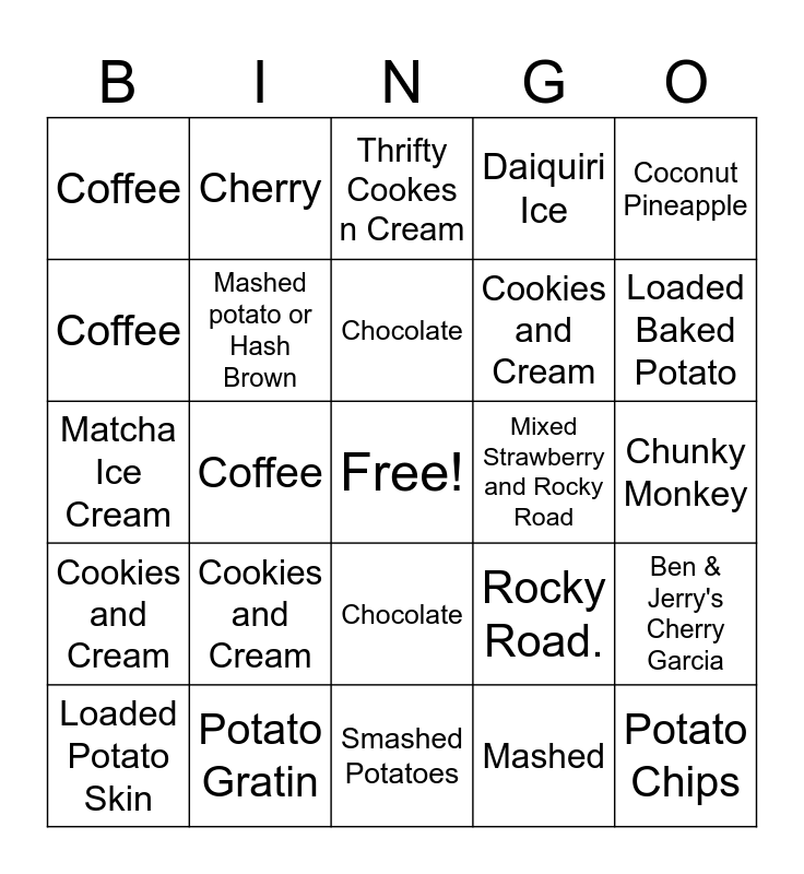 This bingo card has a free space and 63 words: Bacon & Yogurt, Banana Split, Bananas Foster, Ben & Jerry's Cherry Garcia, Boiled Power Potato, Boiled Sweet Potato, Cherry, Chip, Chocolate, Chocolate, Chocolate, Chocolate Chip Cookies, Chunky Monkey, Coconut Pineapple, Coffee, Coffee, Coffee, Coffee, Coffee Ice Cream, Cookies and Cream, Cookies and Cream, Cookies and Cream, Daiquiri Ice, Dirty Loaded Tots, Fingerling, Fondant Potatoes, French Fries, Garlic and feta mashed potatoes, Gnocchi Speziato, Green Cardamom and Rose Infused slow churned vanilla ice cream with baklava crumbles and dark chocolate ganache drizzle, Half Pistachio and Half Black Sesame Gelato, Home Fries, In n Out Animal Style, Japanese Sweet Potato, Loaded Baked Potato, Loaded Potato Skin, Mashed, Mashed, Mashed, Mashed potato or Hash Brown, Matcha Ice Cream, Mixed Strawberry and Rocky Road, Papa Rellena, Patatas Bravas, Potato Chips, Potato Gratin, Roasted Yukon Gold potatoes drizzled in olive oil with Rosemary and salt & pepper, Rocky Road., Rum Raisin Ice Cream, Sea Salt and Vinegar Potato Chips, Sea Salt and Vinegar Potato Chips, Smashed Potatoes, Spudbros Jacket Potato, Strawberry Cheesecake, Sweet Potato Fry, Thrifty Cookes n Cream, Ube, Vanilla + Coffee + Mango with Chocolate Topping, Vanilla or Coffee, Waffle Fries, Waffle Fry, Waffle Fry and Wanderlust's Japanese Neapolitan.