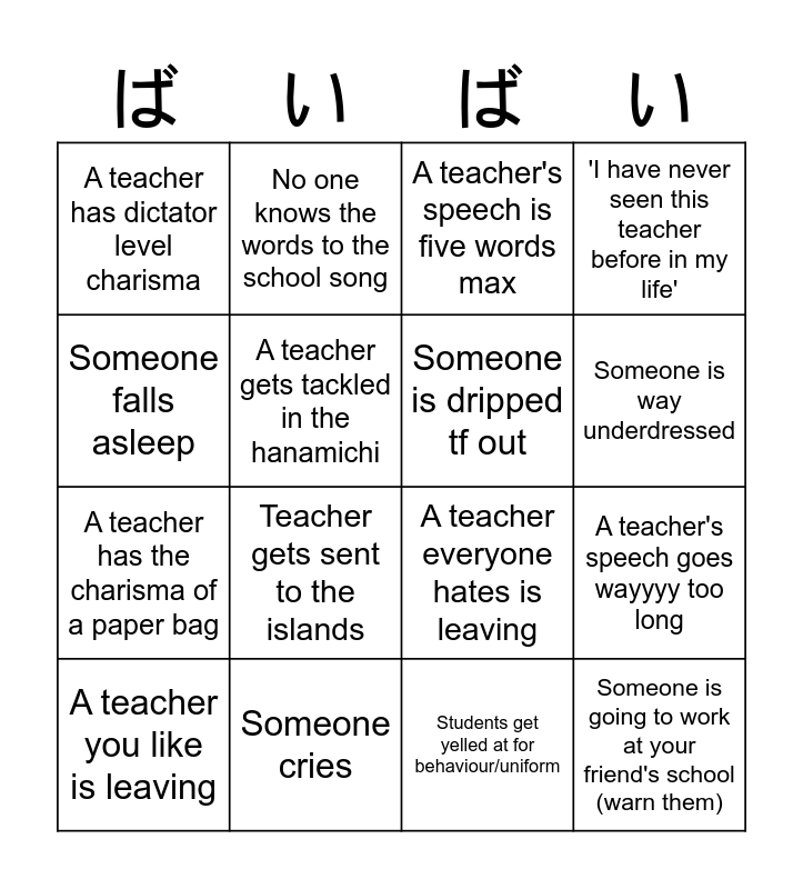 This bingo card has 16 words: Someone cries, A teacher's speech goes wayyyy too long, A teacher's speech is five words max, A teacher has dictator level charisma, A teacher has the charisma of a paper bag, No one knows the words to the school song, A teacher everyone hates is leaving, Students get yelled at for behaviour/uniform, Someone falls asleep, A teacher gets tackled in the hanamichi, A teacher you like is leaving, 'I have never seen this teacher before in my life', Teacher gets sent to the islands, Someone is way underdressed, Someone is dripped tf out and Someone is going to work at your friend's school (warn them).
