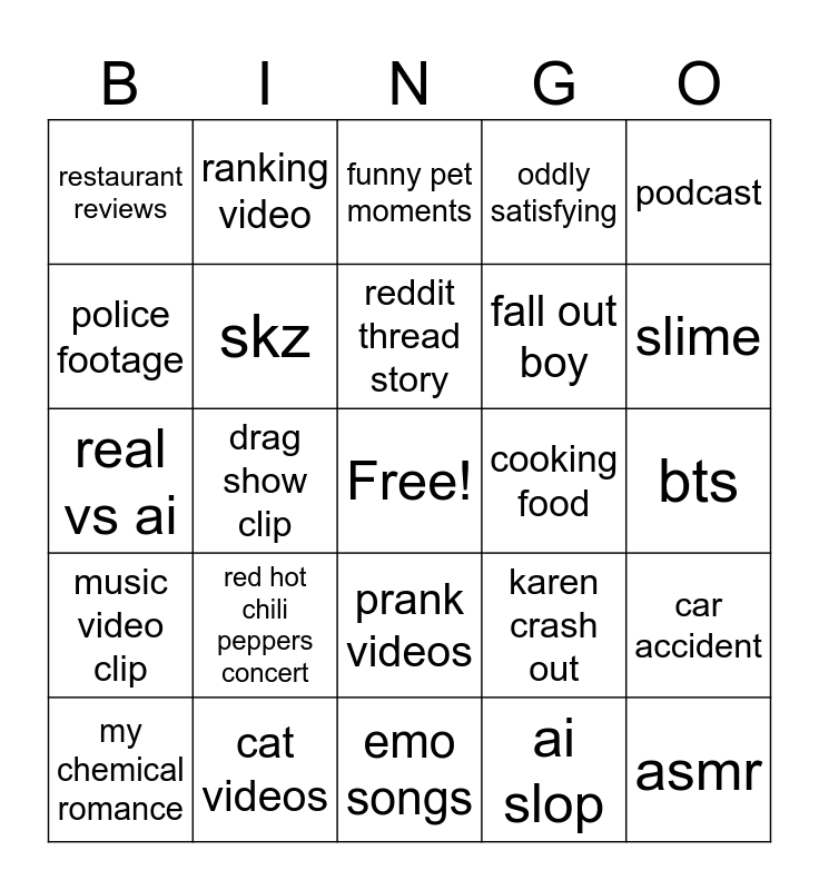 This bingo card has a free space and 24 words: red hot chili peppers concert, cat videos, reddit thread story, my chemical romance, podcast, restaurant reviews, police footage, ranking video, cooking food, prank videos, fall out boy, real vs ai, karen crash out, car accident, skz, ai slop, bts, funny pet moments, slime, drag show clip, asmr, music video clip, oddly satisfying and emo songs.