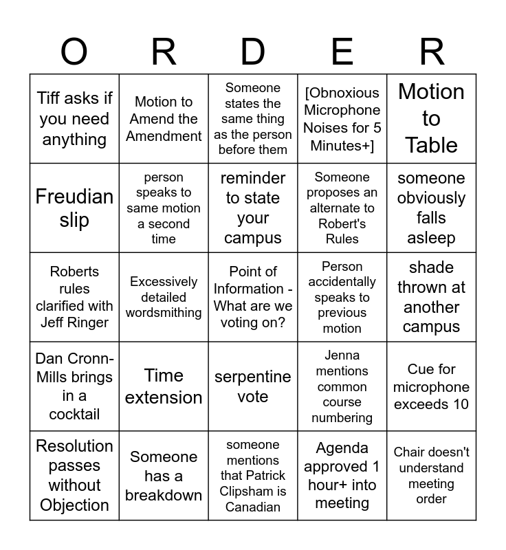 This bingo card has a free space and 44 words: Motion to amend the amendment, Chair doesn't understand meeting order, Roberts rules snafu results in second vote count, Resolution passes without Objection, Member complains out of order, Agenda approved 1 hour+ into meeting, Someone states the same thing as the person before them, Call the question!, Motion to Table, Someone has a breakdown, [Obnoxious Microphone Noises for 5 Minutes+], Person accidentally speaks to previous motion, serpentine vote, Time extension, Gary Starr mentions being the longest serving negotiator, someone mentions that Patrick Clipsham is Canadian, person uses the wrong mic, Roberts rules clarified with Jeff Ringer, Motion to reconsider, someone obviously falls asleep, Motion to Amend the Amendment, Pat drops an fbomb, Unclear resolution has many interpretations, Tiff asks if you need anything, expletive stated into mic, shade thrown at another campus, Matt Hyle mentioned, Negotiator states opposite position of another negotiator, Jenna mentions common course numbering, Dan Cronn-Mills brings in a cocktail, Cindy Harley randomly dances, Cue for microphone exceeds 10, Someone tries to speak after the question has been called, Attempt to pass motion despite that ammendment is being voted on, Excessively detailed wordsmithing, Session ends late, Fridge is out of diet Mt. Dew, Point of clarification used to speak to a motion, reminder to state your campus, Freudian slip, Someone proposes an alternate to Robert's Rules, "friendly amendment", person speaks to same motion a second time and spot two delegates texting eachother.