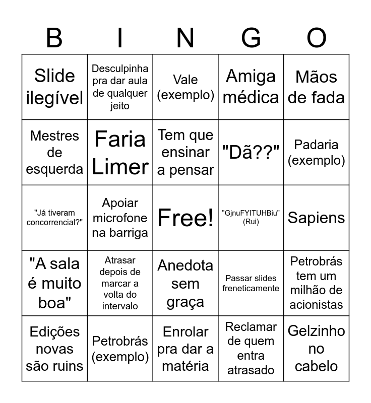 This bingo card has a free space and 35 words: Fascismo, Nhá Benta, Nerd, Faria Limer, Anedota sem graça, Amiga médica, Mestres de esquerda, DCO melhor departamento, Tem que ensinar a pensar, "É muito legal", "Já tiveram concorrencial?", Mãos de fada, Grade curricular ruim, "Isso aqui não é cursinho", Slide ilegível, "GjnuFYITUHBiu" (Rui), Reclamar de quem entra atrasado, Apoiar microfone na barriga, "A sala é muito boa", Gelzinho no cabelo, Passar slides freneticamente, Edições novas são ruins, Petrobrás tem um milhão de acionistas, Petrobrás (exemplo), Vale (exemplo), Padaria (exemplo), Mariana e Brumadinho, "Hoje tudo é digital", "Dã??", Sapiens, "Não é pra escrever isso na prova", Enrolar pra dar a matéria, Atrasar depois de marcar a volta do intervalo, Desculpinha pra dar aula de qualquer jeito and Desenhar órgãos de administração.