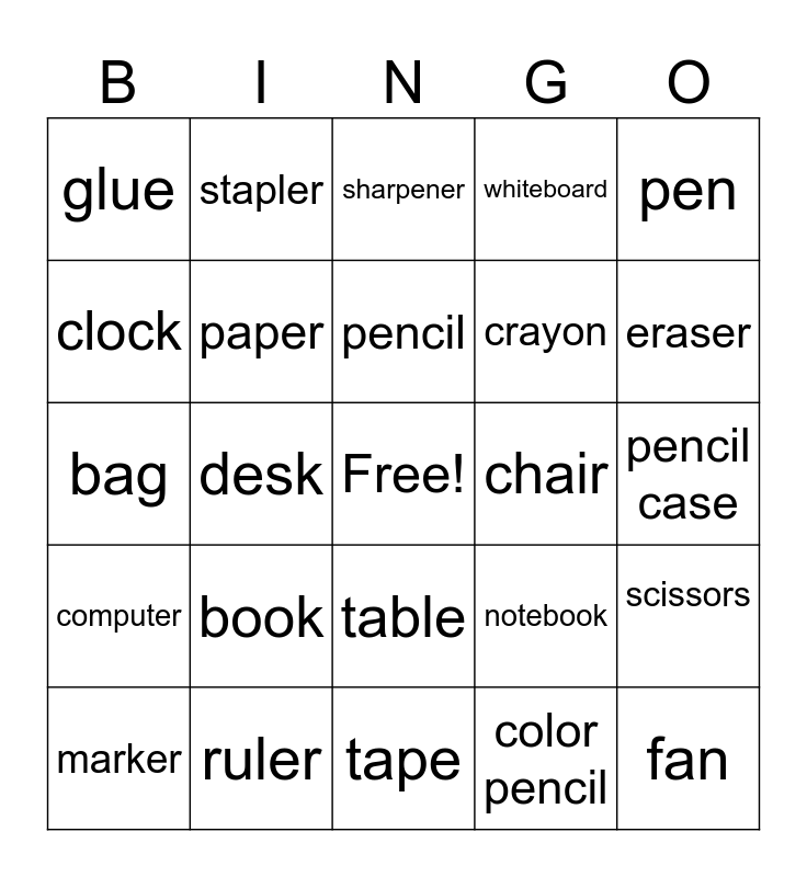 This bingo card has a free space and 24 words: book, ruler, pencil, marker, pen, glue, clock, stapler, chair, table, crayon, bag, notebook, scissors, paper, color pencil, pencil case, sharpener, eraser, desk, fan, computer, whiteboard and tape.