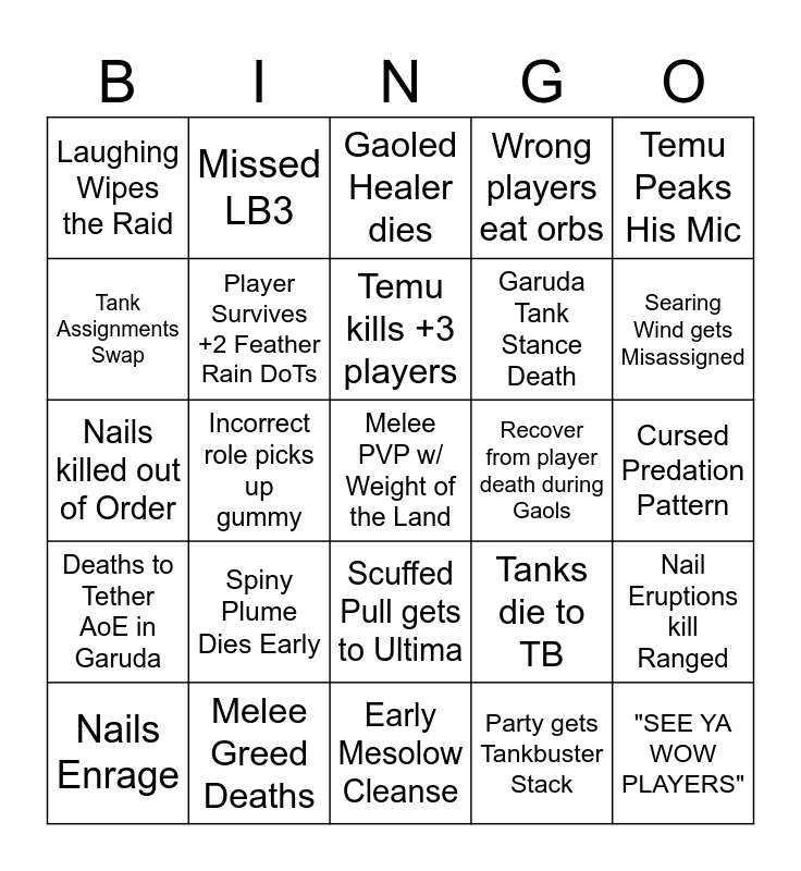 This bingo card has 25 words: Spiny Plume Dies Early, Early Mesolow Cleanse, Temu kills +3 players, Nails Enrage, Temu Peaks His Mic, Laughing Wipes the Raid, Tank Assignments Swap, Missed LB3, Recover from player death during Gaols, Scuffed Pull gets to Ultima, Garuda Tank Stance Death, Nails killed out of Order, Tanks die to TB, Nail Eruptions kill Ranged, Player Survives +2 Feather Rain DoTs, "SEE YA WOW PLAYERS", Cursed Predation Pattern, Gaoled Healer dies, Searing Wind gets Misassigned, Incorrect role picks up gummy, Melee PVP w/ Weight of the Land, Melee Greed Deaths, Deaths to Tether AoE in Garuda, Wrong players eat orbs and Party gets Tankbuster Stack.