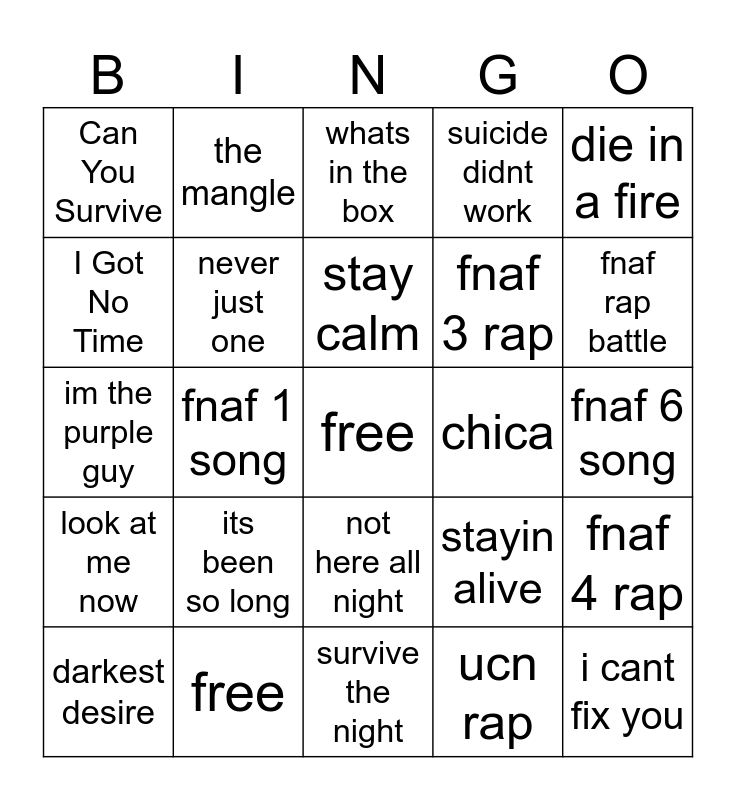 This bingo card has a free space and 24 words: its been so long, free, stay calm, darkest desire, die in a fire, Can You Survive, I Got No Time, the mangle, chica, not here all night, fnaf 3 rap, im the purple guy, stayin alive, fnaf 4 rap, never just one, ucn rap, fnaf 6 song, whats in the box, fnaf rap battle, fnaf 1 song, i cant fix you, look at me now, suicide didnt work and survive the night.