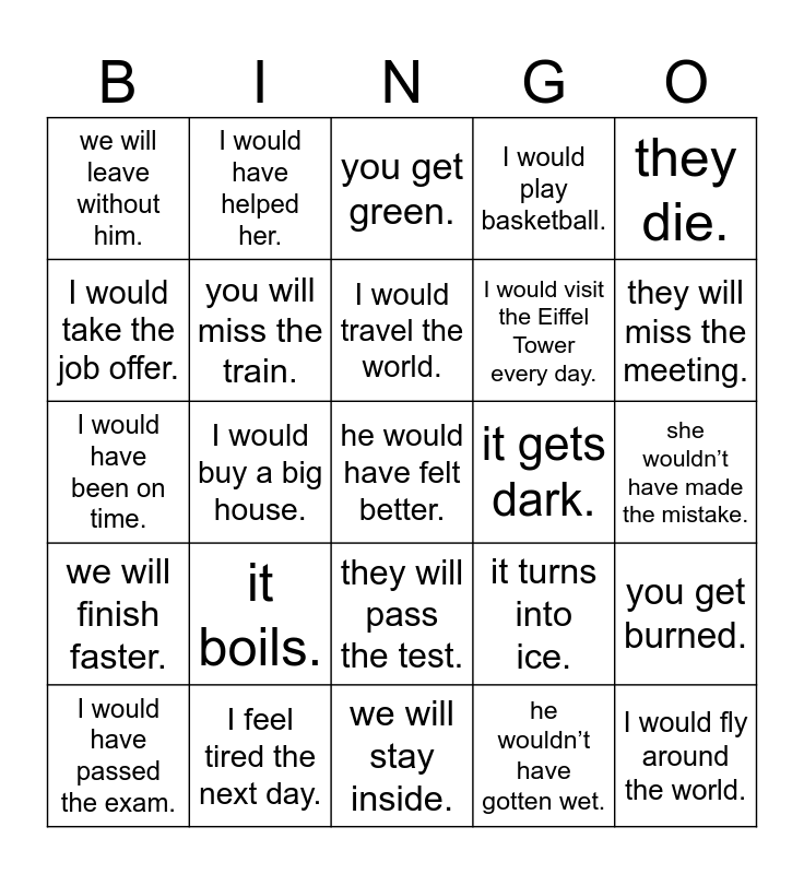 This bingo card has 25 words: it boils., we will stay inside., I would travel the world., I would have passed the exam., they die., we will leave without him., I would take the job offer., I would have helped her., it gets dark., they will pass the test., I would visit the Eiffel Tower every day., I would have been on time., it turns into ice., you get burned., you will miss the train., I would fly around the world., she wouldn’t have made the mistake., you get green., they will miss the meeting., I would buy a big house., he would have felt better., I feel tired the next day., we will finish faster., I would play basketball. and he wouldn’t have gotten wet..