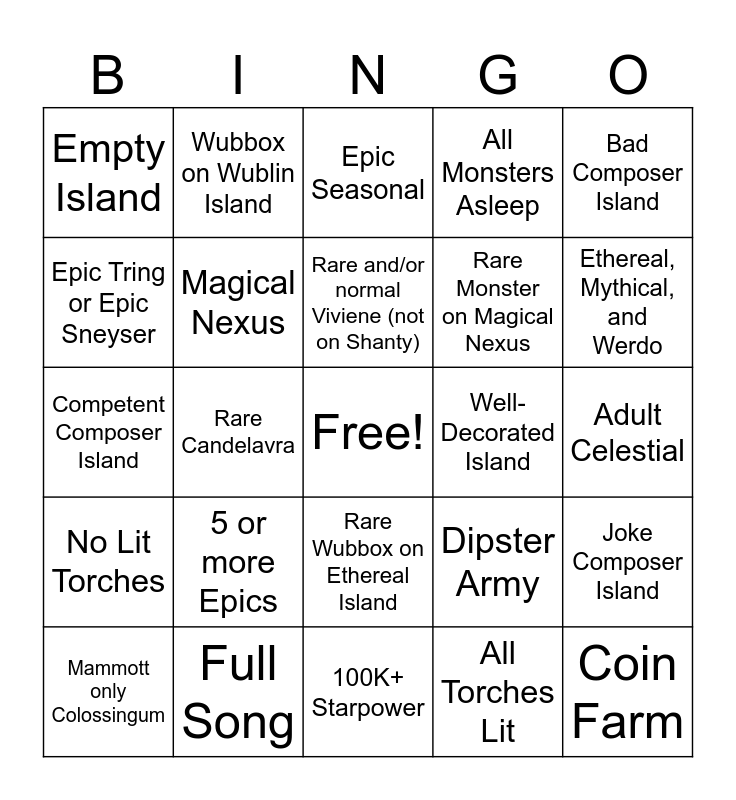 This bingo card has a free space and 44 words: Really Fast Island, 5 or more Epics, Epic on Amber Island, All Torches Lit, Noob Plant Island, Epic Jam Boree, Magical Nexus, Really Slow Island, All Monsters Asleep, Coin Farm, Empty Island, Full Song, Dipster Army, Adult Celestial, Rare Wublin, Epic Wubbox, 100K+ Starpower, Well-Decorated Island, Zynth Farm, Competent Composer Island, Wubbox on Wublin Island, Rare Wubbox on Ethereal Island, 5 or more Biggified Monsters, Bad Composer Island, Rare Tuskski, Rare Wubbox on Fire Haven, Rare and/or normal Viviene (not on Shanty), Rare and/or normal Monculus (not on Shanty), Joke Composer Island, Mammott only Colossingum, Seasonal Island Skin (not current one), Epic Seasonal, Epic Ethereal, Whaill and/or Vhenshun (Ethereal Workshop), No Lit Torches, Buzzinga, Colossingum Trophy Collector, Both Werdos, Ethereal, Mythical, and Werdo, Epic Tring or Epic Sneyser, Rare Candelavra, Spurrit on Fire Oasis, Rare Monster on Magical Nexus and Rare Mythical.