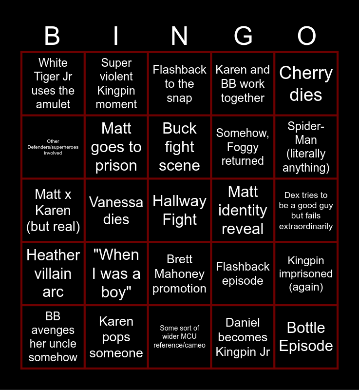 This bingo card has a free space and 24 words: "When I was a boy", Karen pops someone, Buck fight scene, BB avenges her uncle somehow, Cherry dies, White Tiger Jr uses the amulet, Other Defenders/superheroes involved, Super violent Kingpin moment, Matt identity reveal, Brett Mahoney promotion, Somehow, Foggy returned, Matt x Karen (but real), Flashback episode, Kingpin imprisoned (again), Matt goes to prison, Daniel becomes Kingpin Jr, Dex tries to be a good guy but fails extraordinarily, Flashback to the snap, Spider-Man (literally anything), Vanessa dies, Bottle Episode, Heather villain arc, Karen and BB work together and Some sort of wider MCU reference/cameo.