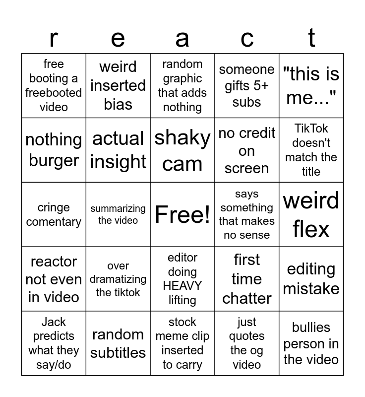 This bingo card has a free space and 24 words: over dramatizing the tiktok, random subtitles, shaky cam, Jack predicts what they say/do, "this is me...", free booting a freebooted video, nothing burger, weird inserted bias, says something that makes no sense, editor doing HEAVY lifting, no credit on screen, cringe comentary, first time chatter, editing mistake, actual insight, just quotes the og video, weird flex, random graphic that adds nothing, TikTok doesn't match the title, summarizing the video, bullies person in the video, reactor not even in video, someone gifts 5+ subs and stock meme clip inserted to carry.