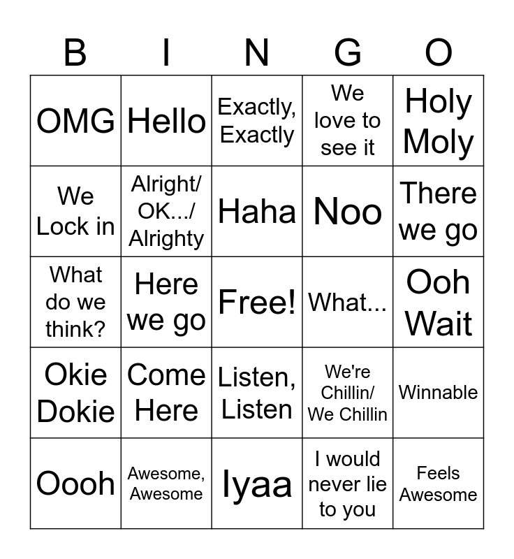This bingo card has a free space and 39 words: Venture, Unfortunate/ Unlucky, Uwaa/ Whoaa, Alright/ OK.../ Alrighty, Oooh, Listen, Listen, Haha, Wait, wait, wait, Holy Moly, Okie Dokie, Here we go, We love to see it, Feels Awesome, Ooh Wait, What..., Come Here, Gottem, OMG, It's Over/ It's Jover, We're Chillin/ We Chillin, We Lock in, Iyaa, Noo, There we go, Awesome, Gotcha, We Climb, That's Ok, Right, Hello, That's awesome, We'll See, Exactly, Exactly, Awesome, Awesome, I would never lie to you, I don't think x is the play, Winnable, What do we think? and I respect it.