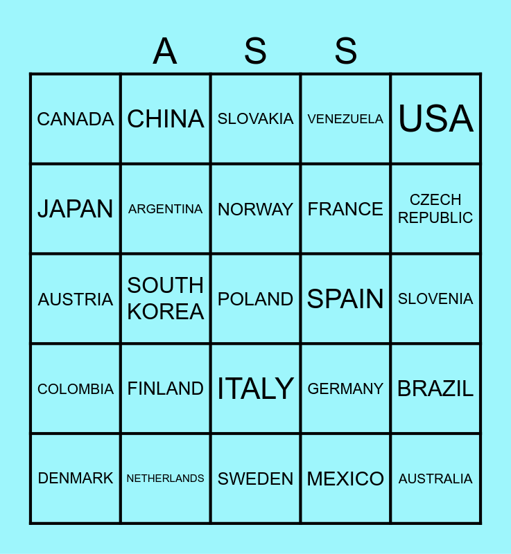 This bingo card has 25 words: FINLAND, SWEDEN, NORWAY, DENMARK, USA, CANADA, JAPAN, CHINA, SPAIN, ITALY, FRANCE, AUSTRIA, GERMANY, BRAZIL, ARGENTINA, AUSTRALIA, SLOVENIA, SLOVAKIA, CZECH REPUBLIC, SOUTH KOREA, POLAND, NETHERLANDS, COLOMBIA, VENEZUELA and MEXICO.