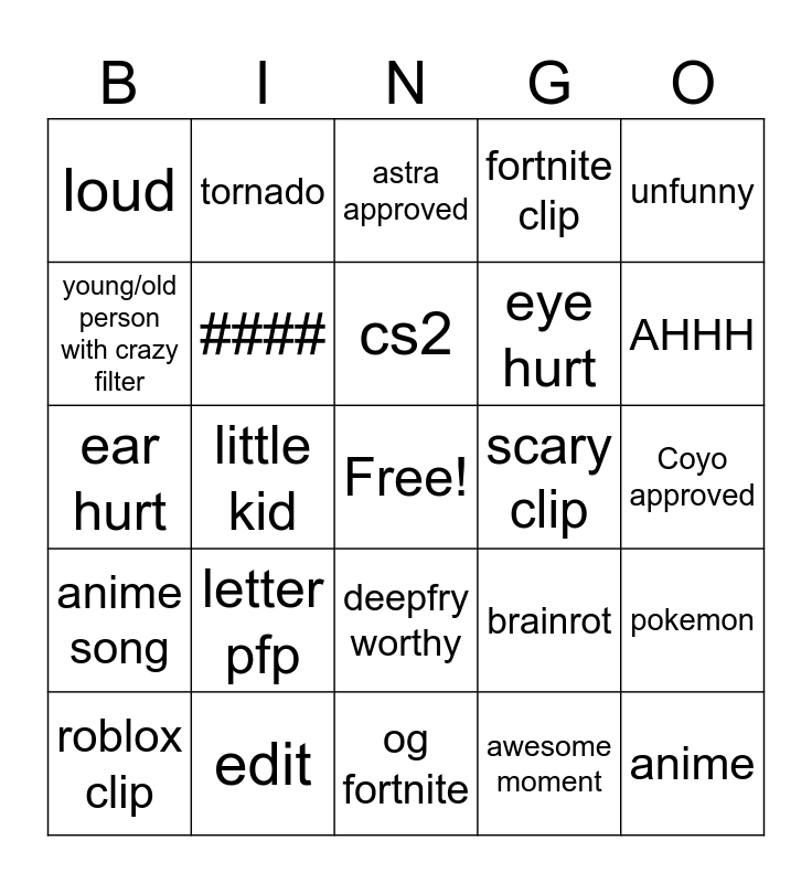 This bingo card has a free space and 24 words: letter pfp, edit, cs2, roblox clip, unfunny, loud, young/old person with crazy filter, tornado, scary clip, deepfry worthy, eye hurt, ear hurt, brainrot, pokemon, ####, awesome moment, Coyo approved, astra approved, AHHH, little kid, anime, anime song, fortnite clip and og fortnite.