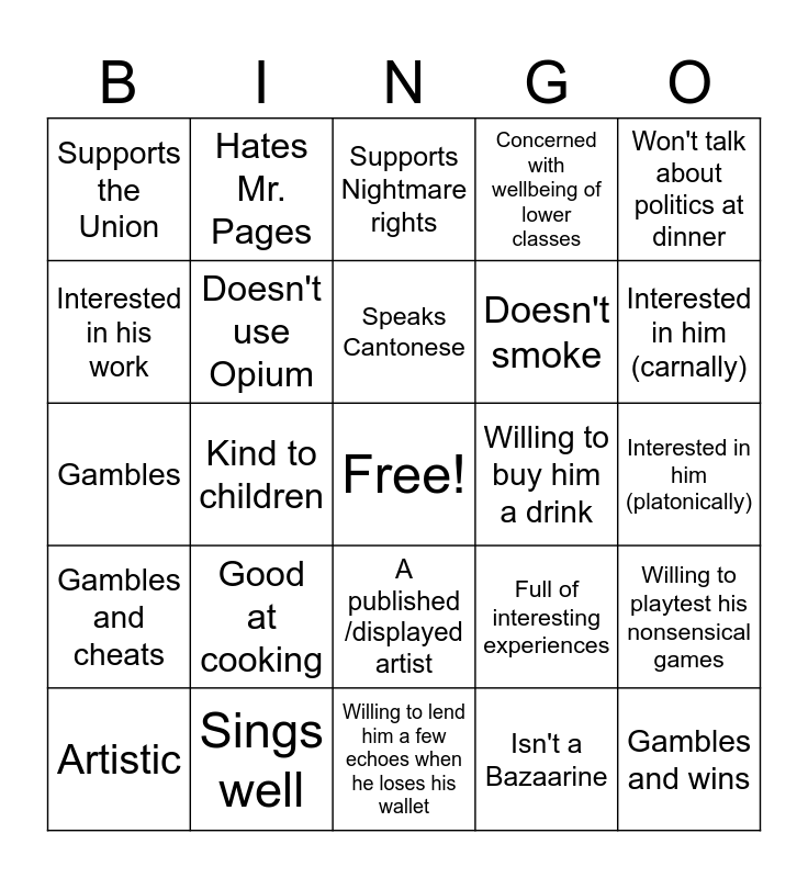 This bingo card has a free space and 24 words: Good at cooking, Sings well, Speaks Cantonese, Artistic, Won't talk about politics at dinner, Supports the Union, Interested in his work, Hates Mr. Pages, Willing to buy him a drink, A published /displayed artist, Doesn't smoke, Gambles, Full of interesting experiences, Willing to playtest his nonsensical games, Doesn't use Opium, Isn't a Bazaarine, Interested in him (platonically), Supports Nightmare rights, Interested in him (carnally), Kind to children, Gambles and wins, Gambles and cheats, Concerned with wellbeing of lower classes and Willing to lend him a few echoes when he loses his wallet.