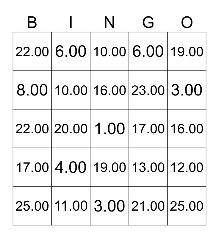 ⚠ This card has duplicate items: 1.00 (2), 2.00 (2), 3.00 (2), 4.00 (2), 5.00 (2), 6.00 (2), 7.00 (2), 8.00 (2), 9.00 (2), 10.00 (2), 11.00 (2), 12.00 (2), 13.00 (2), 14.00 (2), 15.00 (2), 16.00 (2), 17.00 (2), 18.00 (2), 19.00 (2), 20.00 (2), 21.00 (2), 22.00 (2), 23.00 (2), 24.00 (2), 25.00 (2)