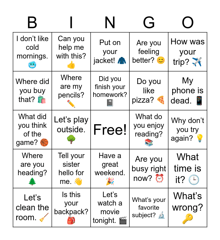 This bingo card has a free space and 30 words: Is this your backpack? π, How bright your classroom is! π«, Letβs play outside. π³, How do you spend your free time? β½, I donβt like cold mornings. π₯Ά, Put on your jacket! π§₯, Where are my pencils? βοΈ, Have a great weekend. π, What do you enjoy reading? π, Letβs watch a movie tonight. π¬, Why donβt you try again? π‘, Whatβs wrong? π, Whatβs your favorite subject? π¬, Would you like some juice? π§, My phone is dead. π±, What are you doing here? π€, Are you busy right now? β°, Where are you heading? π², Tell your sister hello for me. π, How was your trip? βοΈ, What did you think of the game? π, I hope I pass the test. π, Can you help me with this? π, Do you like pizza? π, Where did you buy that? ποΈ, Are you feeling better? π, What time is it? π, Letβs clean the room. π§Ή, Did you finish your homework? π and See you tomorrow. π.