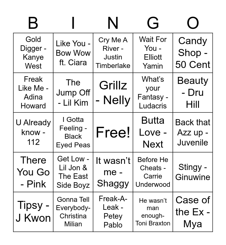 This bingo card has a free space and 29 words: Tipsy - J Kwon, Hey there Delilah - Plain White T’s, I Gotta Feeling - Black Eyed Peas, Bleeding Love - Leona Lewis, Gold Digger - Kanye West, Cry Me A River - Justin Timberlake, The Jump Off - Lil Kim, Get Low - Lil Jon & The East Side Boyz, Butta Love - Next, Gonna Tell Everybody- Christina Milian, Back that Azz up - Juvenile, Case of the Ex - Mya, Freak-A-Leak - Petey Pablo, He wasn’t man enough- Toni Braxton, Beauty - Dru Hill, Ignition - R. Kelly, It wasn’t me - Shaggy, There You Go - Pink, Candy Shop - 50 Cent, U Already know - 112, Before He Cheats - Carrie Underwood, Salt Shaker - Ying Yang Twins, What’s your Fantasy - Ludacris, Freak Like Me - Adina Howard, Wait For You - Elliott Yamin, Like You - Bow Wow ft. Ciara, Stingy - Ginuwine, Grillz - Nelly and Lovers and Friends - Lil Jon.