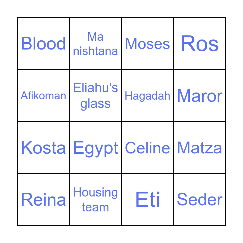 This bingo card has 32 words: Free!, charoset, Matza, Pharoah, Seder, Hagadah, Afikoman, Chametz, Ma nishtana, 10 plagues, Maror, Moses, Chad gadya, Maureen, Housing team, David, Yael, Celine, Eitan Penn, Renny, Maria, Efrat, Eti, Hanna Alexander, Reina, Ros, Kosta, Eliahu's glass, Blood, Frogs, Darkness and Egypt.