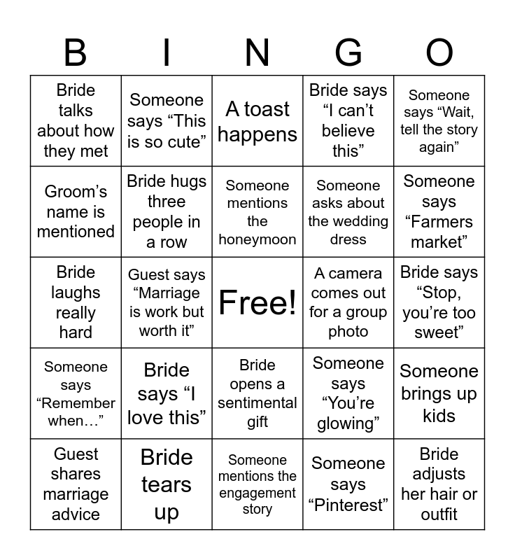 This bingo card has a free space and 24 words: Bride says “I love this”, Bride tears up, Someone mentions the honeymoon, Guest shares marriage advice, Someone says “Wait, tell the story again”, Bride talks about how they met, Groom’s name is mentioned, Someone says “This is so cute”, A camera comes out for a group photo, Bride opens a sentimental gift, Someone asks about the wedding dress, Bride laughs really hard, Someone says “You’re glowing”, Someone brings up kids, Bride hugs three people in a row, Someone says “Pinterest”, Bride says “Stop, you’re too sweet”, A toast happens, Someone says “Farmers market”, Guest says “Marriage is work but worth it”, Bride adjusts her hair or outfit, Someone says “Remember when…”, Bride says “I can’t believe this” and Someone mentions the engagement story.