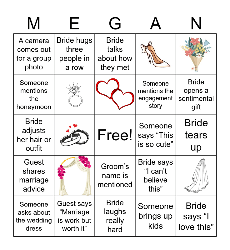 This bingo card has 12 images, a free space and 25 words: Bride says “I love this”, Bride tears up, Someone mentions the honeymoon, Guest shares marriage advice, Someone says “Wait, tell the story again”, Bride talks about how they met, Groom’s name is mentioned, Someone says “This is so cute”, A camera comes out for a group photo, Bride opens a sentimental gift, Someone asks about the wedding dress, Bride laughs really hard, Someone says “You’re glowing”, Someone brings up kids, Bride hugs three people in a row, Someone says “Pinterest”, Bride says “Stop, you’re too sweet”, A toast happens, Someone says “Farmers market”, Guest says “Marriage is work but worth it”, Bride adjusts her hair or outfit, Someone says “Remember when…”, Bride says “I can’t believe this”, Someone mentions the engagement story and Someone asks to see the bride's ring.
