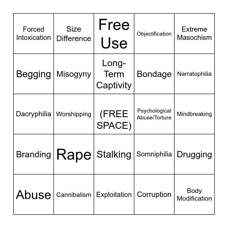 This bingo card has a free space and 24 words: Rape, Cannibalism, Long-Term Captivity, Abuse, Extreme Masochism, Forced Intoxication, Begging, Size Difference, Psychological Abuse/Torture, Stalking, Bondage, Dacryphilia, Somniphilia, Drugging, Misogyny, Corruption, Mindbreaking, Free Use, Narratophilia, Worshipping, Body Modification, Branding, Objectification and Exploitation.